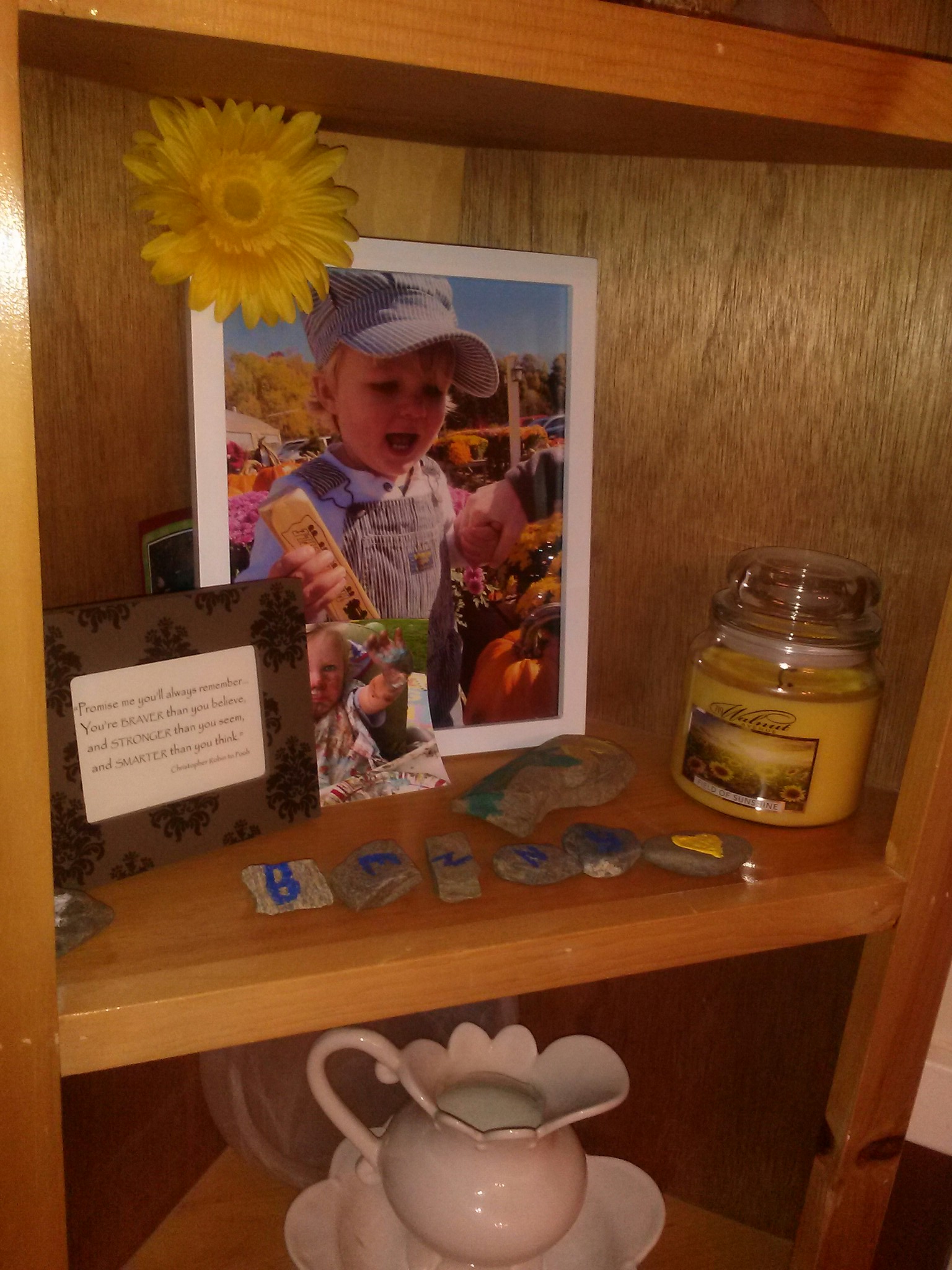 In the dining room, we have a ‘Benny shelf.’ It’s where his picture that we used for his obituary is kept as well as many, many other treasures that we have received. We have the rocks that my friends daughters painted with Benny’s name on them, angels and sunflowers (this is before we made the sunflower connection, right after the accident). We have a picture of him covered in cake from his first birthday because this makes Darcy laugh. There is a sunflower that was given to me by my LDS friends in a basket (again, they had no idea about the connection). I also have a sunflower candle and the Winnie the Pooh quote from my friend Sue. She said that she had the Pooh quote forever and it seemed fitting, not knowing that we had used it in Benny’s services. We usually have Benny’s bus there too, which is his little matchbox car that he was obsessed with. He would walk around and make engine noises, say ‘bus’ and drive it everywhere (including a friends knee’s right after surgery). This has become our Benny space.