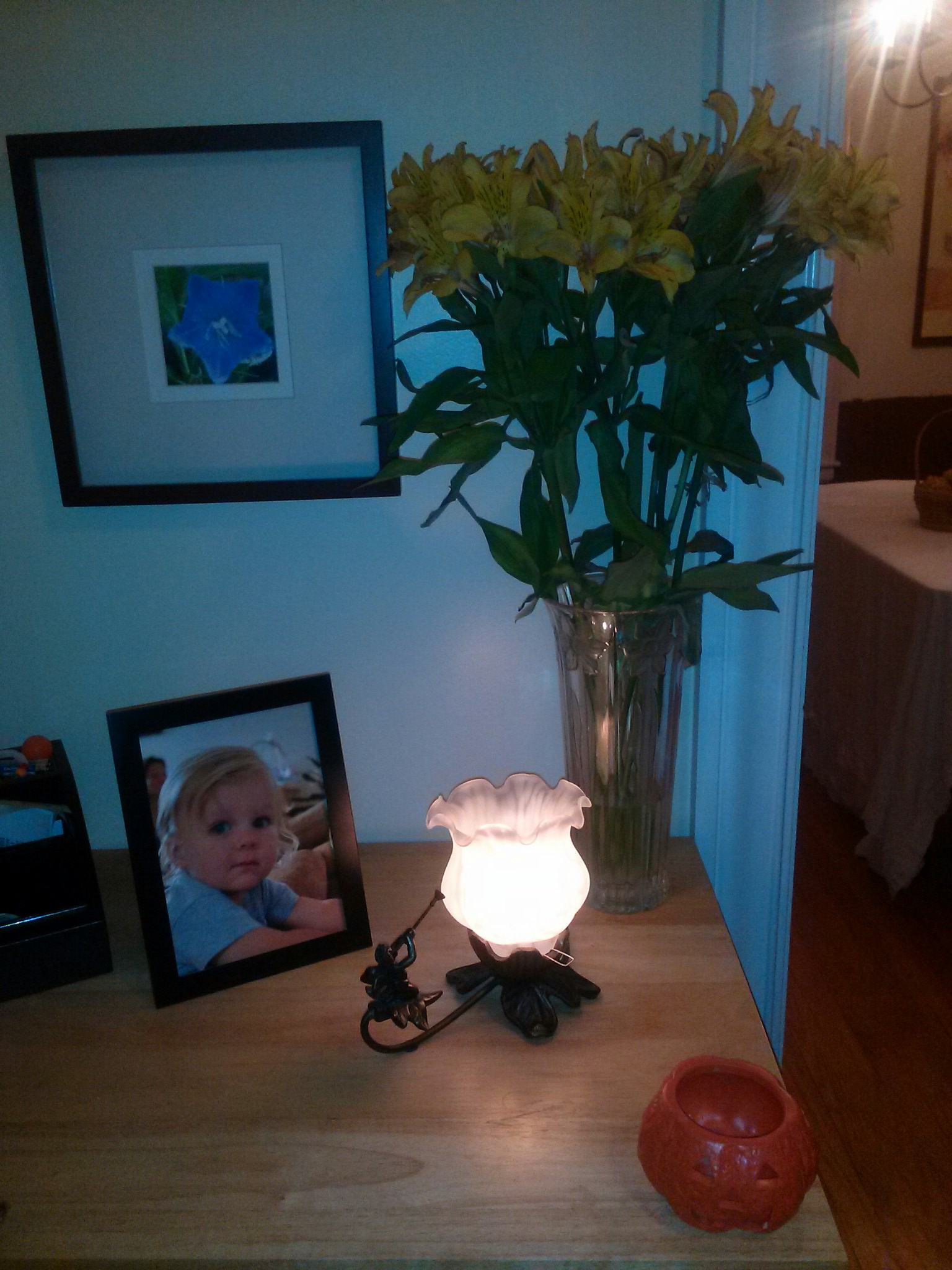 We also have a space in our front hall, which is right on the other side of the wall from the dining room. Sue and her family had given us a memory lamp after Benny’s passing. It wasn’t until after we tore the house apart and then put it back together that I realized it belonged in the front hall, right next to another beautiful picture of my son, given to us by Parker’s, sisters, mother in law. This lamp is on day and night and never gets shut off. It’s our ‘candle’ that always stays lit in his memory. It’s a reminder of how he brightened our world. A fitting tribute to the dude.