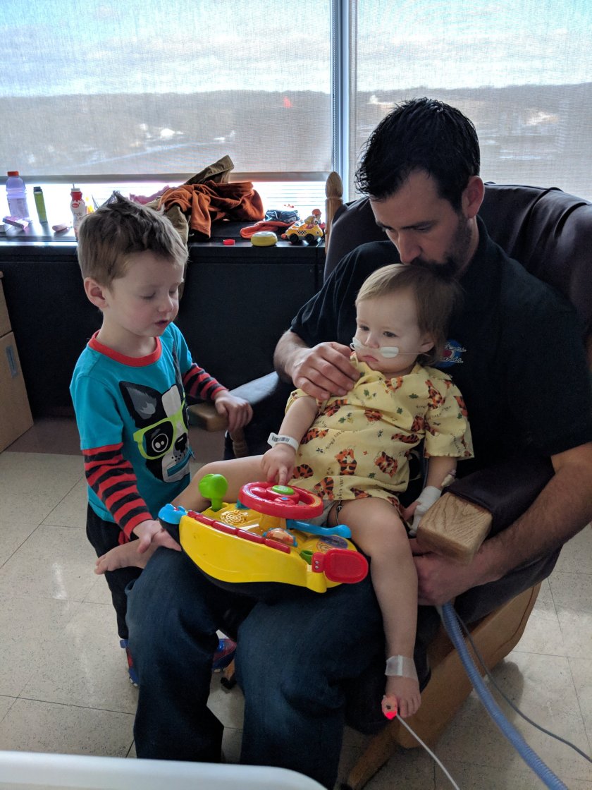 Then the beeping started. Perry was having a coughing fit. I assumed it was our room, but no one reacted at first and I was on a bed with a toddler strapped to a whole bunch of monitors on top of me. There wasn’t much I could do. Someone came running into the room. Then another person and another. It became a flurry of activity. Perry had set off the heart monitor. I tried to stay calm. I was hearing words like ‘high flow oxygen’ and ‘pedi ICU.’ I called my husband and told him to get to the hospital. Something was wrong.