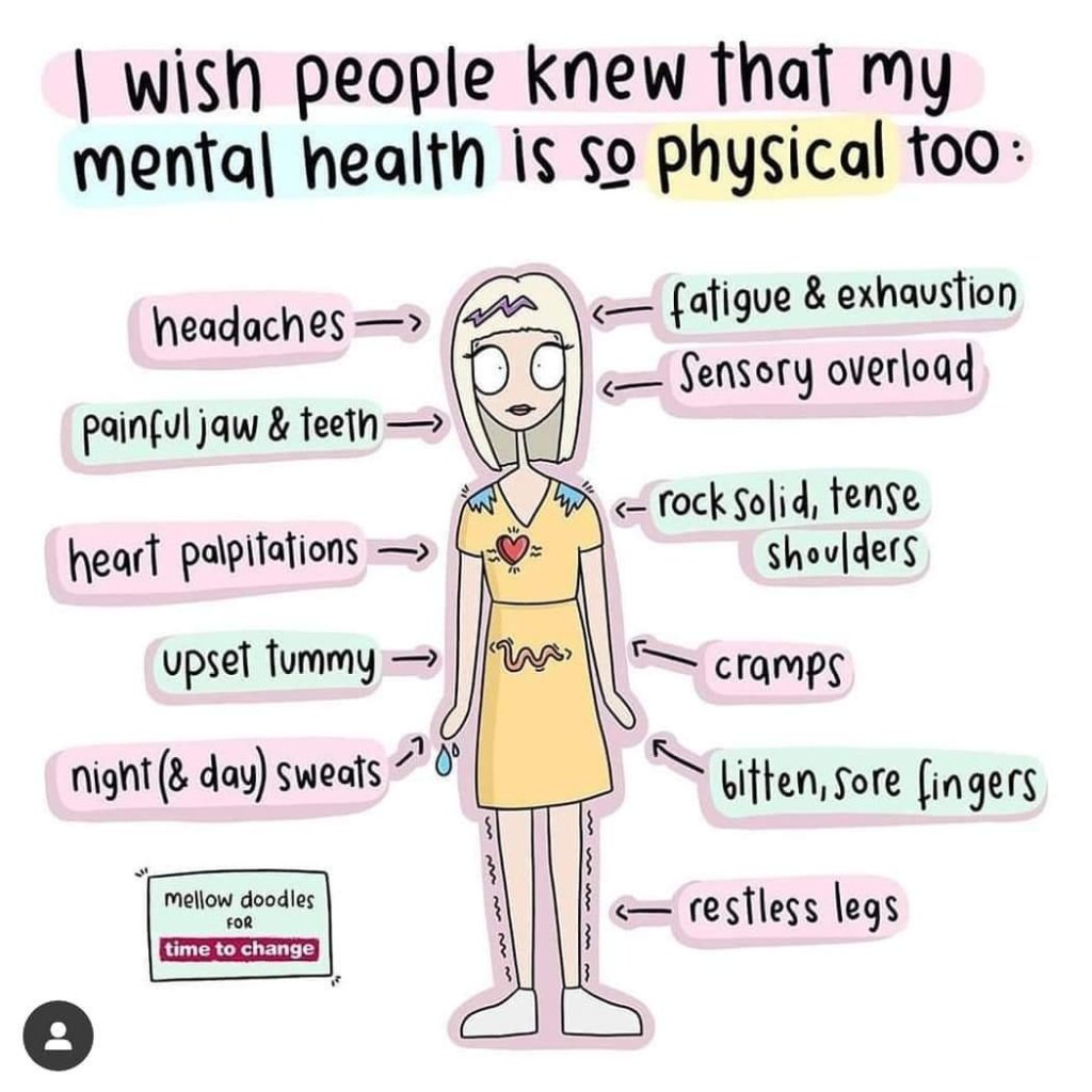 I look at the above graphic and literally have every single symptom from the shoulders up. My shoulders are tight, which leads to my neck and then my jaw and then my aching head. Apparently I’m clenching my jaw so tight that I fractured a tooth in my sleep (didn’t even know that you could do that). My damn body is tired. Because my mind is tired.